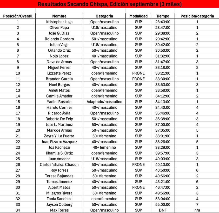 La primera edición de esta nueva etapa de Sacando Chispa se realizó el 13 de septiembre en las instalaciones de SUP Action, en la Bahía de San Juan. El evento reunió a 35 remadores, superando las expectativas de los organizadores pese a haberse anunciado con apenas una semana de anticipación. Con categorías que fueron desde U12 y U18 hasta Open, Master 40+ y Master 50+, la convocatoria dejó claro que hay entusiasmo y potencial para el desarrollo del SUP en la isla.